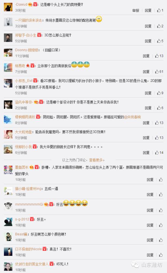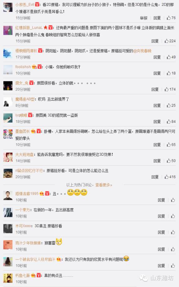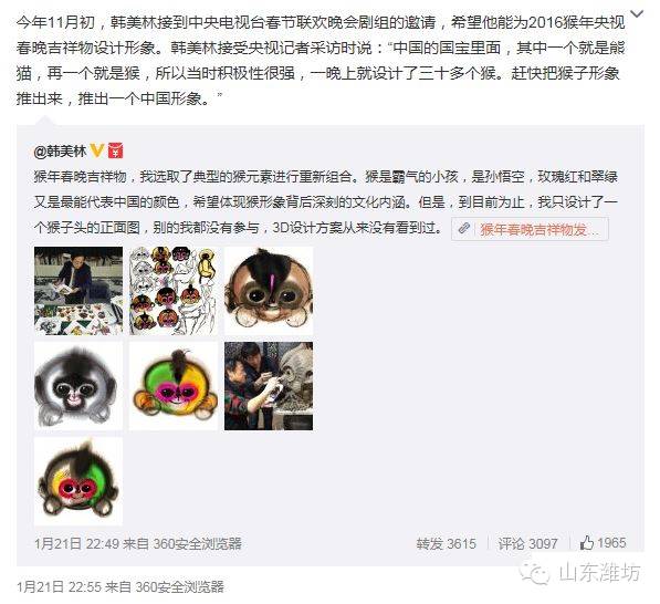 看来这个有些俏皮到“杀马特”的3D版小猴似乎也没能得到作者首肯。翻看一下@北京韩美林艺术馆 官博,置顶帖梳理了韩老师之前的水墨猴《机灵看世界,韩美林的水墨猴画灵动问世》,顿时释然了,大师这次似乎是躺枪了……