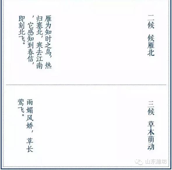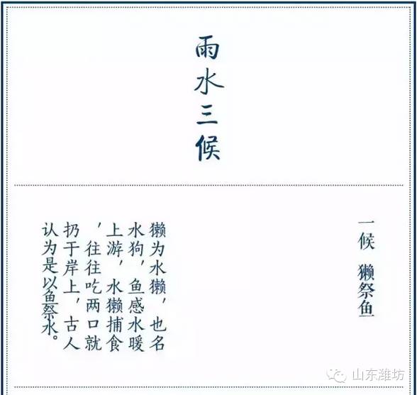 按照传统,每个节气都有三候,一候五日。我国古代将雨水分为三候:“一候獭祭鱼;二候鸿雁来;三候草木萌劝。”