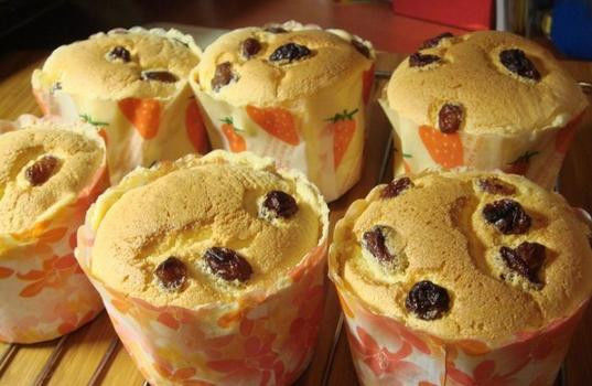 食材:65g低筋面粉、4个鸡蛋、30g玉米油、30g牛奶或水、60g细砂糖、适量提子干