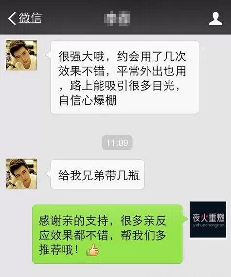 超级火爆的销量,超级劲爆的好评,挑逗你的嗅觉中枢,点燃“ta”心中的欲火。我们的产品我们说好不算好,买家说好才是的的确确的好!下面截取我们用户的微信反馈情况:有人说自信心爆棚了,有人说异性缘大增了,你是不是很心动?