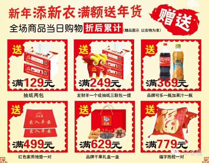 满额送年货~赠品和众客隆是一样的哦~所以您可以去您觉得方便的商场购物