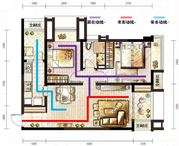 通透性最佳——对侧采光通风 通透性次佳——相邻侧采光通风 通透性不佳——单面采光通风 动线是指人们在户内活动的路线,动线流畅与否将影响人们进行各种活动时能否实现顺利转换。户型的设计影响到动线的走向,而动线的走向会影响到居住的品质。好的动线能够提升小户型利用率,而差的动线会使大户型变得“大而无当”,浪费空间。户内主要动线有三类,分别是居住动线、家务动线、来客动线。