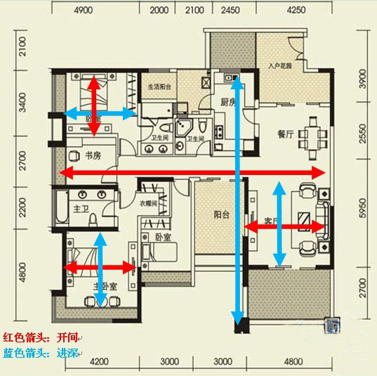 首先讲两个概念: 开间、进深:习惯上,我们把房间的主采光面成为开间(面宽),与其垂直的称为进深。也可根据房间门的朝向来确定开间和进深,房门进入的方向的距离为进深,左右两边距离为开间。根据《住宅建筑模数协调标准》(GBJ100-87)规定:住宅建筑的开间常采用下列参数:2.1米、2.4米、2.7米、3.0米、3.3米、3.6米、3.9米、 4.2米。(卧室以床顺着摆放的方向为开间,床头依靠的墙宽度为“进深”,卧室内布置床时,床头一般不靠窗台摆放)