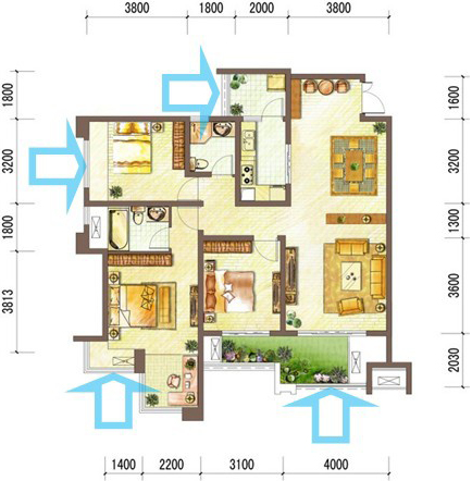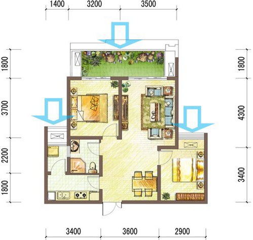 公私分区较好户型(参见前面讲开间和进深的户型) 公私分区较差户型(卧室门直接开在客厅墙壁上,客厅内可看见卧室大部分) 通透性主要是指户型的通风和采光性能。要保证户型具有良好的通透性能,首先要求户型要有良好的进深开间比,即户型比较方正;其次户型最好有两面可以采光和通风,相对两面采光通风最佳(如南北、东西),其次是相邻两面采光(如东和南、南和西、西和北等),只有一面采光通风效果最差。另外厨房厕所是湿气比较重的两个区域,要尽量做到独立采光通风,也就是避免暗厨暗卫。
