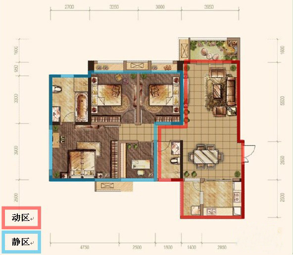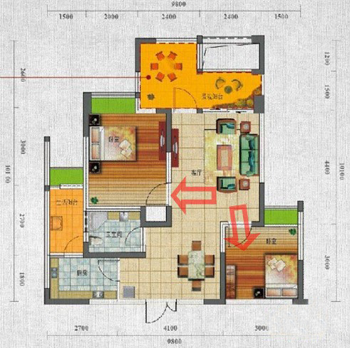 动区:客厅、餐厅、厨房、次卫等。 静区:卧室、书房、主卫等。 动区是人们活动较为频繁的区域,应该靠近入户门设置,尤其是厨房;而静区主要供居住者休息,相对比较安静,应当尽量布置在户型内侧。两者分离,一方面使会客、娱乐或者进行家务的人能够放心活动,另一方面也不会过多打扰休息、学习的人,减少相互之间的干扰。详见以下范例: 动静分区合理户型(卧室布置在户型深侧,距离入户门较远) 干湿分区是指厨房、卫生间这两个湿气较重且较容易产生脏污的房间应与卧室等尽量分离。厨房是家居生活中最主要的污染源,噪声、油烟油污、清洗污水等集中于此,因此厨房的布置要尽可能的靠近进户门,远离卧室、客厅;其次厨房与卫生间是住宅中水管的集中地,从施工成本、能源利用、热水器安装等角度考虑,厨房应与一个卫生间贴邻而处。目前市面上的大部分户型还是考虑到了干湿分区,厨房一般也是设置在入户门最近的位置,但仍有少量灾难级户型,户型完全没有考虑厨房应当如何合理布置。