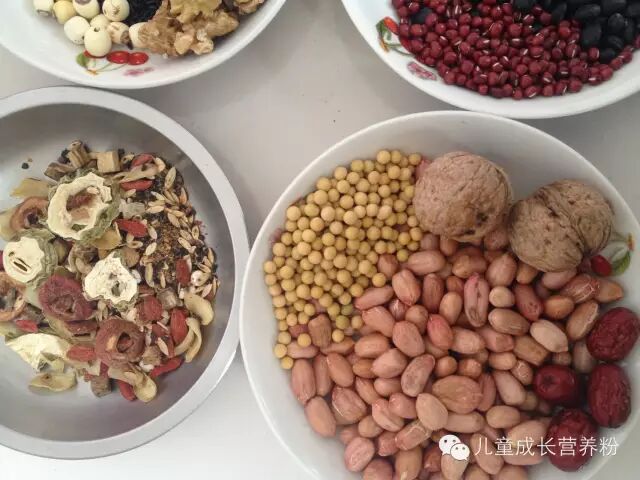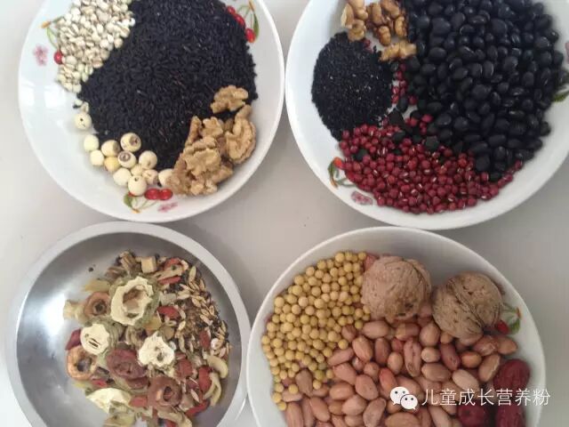 配料:核桃、花生、黑芝麻、黑豆、黑米、山楂、红枣、燕麦 、玉米、百合、枸杞、葛根、山药等。