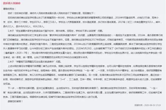 事件最新进展:昌乐县人民政府对此事件进行了统一回复 1.关于“招生简章许诺学生就读后实行直升初中、高中政策。但现在,学校却不承认该政策”问题。 潍坊美加实验学校部分初三学生家长反映“要求学校兑现承诺直升高中”的问题,主要是两方面原因造成的:一是招生不实宣传方面。2016年,昌乐县教育行政部门已明确规定,潍坊美加实验学校初中毕业生不能直升高中。但是,潍坊美加实验学校在2017年招生时,印制的宣传单页、个别教师在微信朋友圈发布的招生信息中有初中直升高中的表述,承诺初中直升高中。二是招生政策变化方面。2019年山东271教育集团利用上级政策,统筹集团资源,解决了潍坊美加实验学校部分学生升入普通高中学习的问题,让今年部分初三家长产生继续直升高中的想法。2020年5月29日,山东省教育厅下发了《关于做好2020年普通高中招生入学工作的通知》(鲁教基字﹝2020﹞7号),民办高中跨市域的招生政策发生重大变化,提出民办高中需要跨市招生的,学校应分市提出生源计划,纳入当地高中招生并参加统一招生考试、统一录取、统一管理。山东271教育集团无法采取2019年的办法满足家长诉求。 2.关于“学籍调不回原籍且无法在昌乐就读高中”问题。 上述出现的情况与学籍调不回原籍二者无必然关系。根据上级政策,学生可以选择在学籍所在地报考,也可以回户籍所在地报考,如果选择在昌乐县报考的将参加全市统一组织的初中学业水平考试,按程序统一录取。昌乐县协助学校科学制定“一生一策”,一方面,针对部分市外户籍学生,全力协调配合,做好回原籍报考指导服务工作。截至目前,有121名学生返回原籍报名,当地教育主管部门已审核通过。另一方面,在潍坊美加实验学校多次召开初三师生政策宣讲会,通过发放一封信、明白纸等形式,鼓励学生积极报考职业院校,用好“3+4”、三二连读、五年一贯制、中专中职、技工学校等多种途径,畅通学生成长成才之路,切实保障学生权益。 针对这一问题,昌乐县政府提出了下一步工作打算:一是尽快化解问题。坚决扛起属地责任,主动担当作为,及时组织县教育和体育部门、潍坊美加实验学校及投资方,及时采取有效措施,“一生一策”制定化解方案,主动回应家长诉求,力求问题圆满解决。二是做好家长沟通工作。组织多方面力量,主动沟通对接学生家长,做好政策解释工作,切实维护正常秩序。三是开展责任追究。根据相关法律法规,视情节对潍坊美加实验学校及相关责任人进行处理。 从这份回应看,昌乐县政府其实表达了三个层面的意思:一是潍坊美加实验学校确实存在宣传“直升高中”的政策,这是违反教育部门规定的;二是2019年时候教育部门也不让“直升高中”,但潍坊美加实验学校“想了办法”让一部分初中毕业生直升了高中;三是现在山东省下了新的政策,县教育局也没权限了,271集团就不能办直升了。请问,谁来为今年的初三毕业生一个说法?是潍坊美加实验学校,还是主管部门昌乐县教育局?
