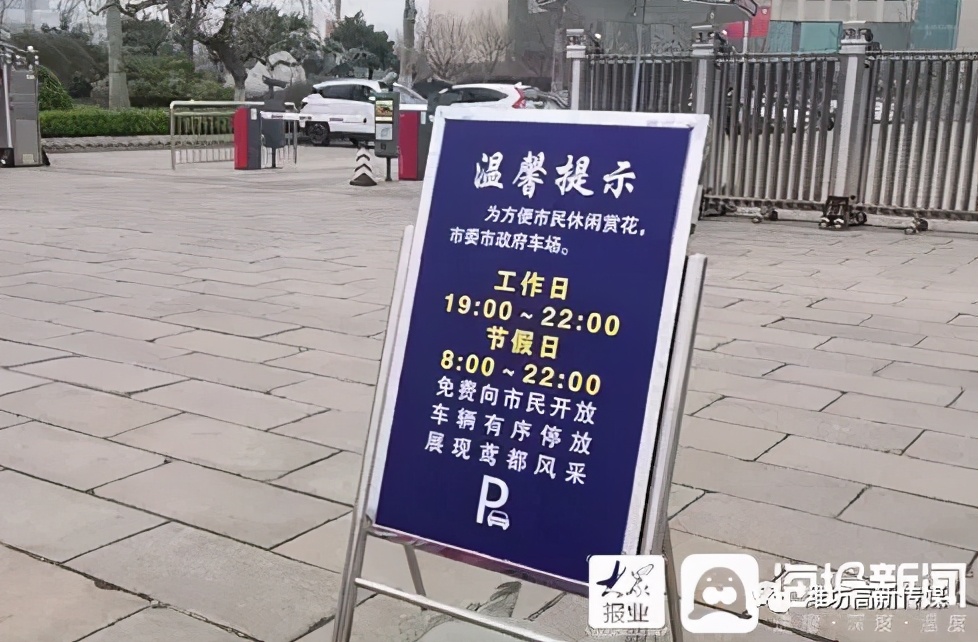为方便市民休闲赏花 潍坊市委市政府停车场免费向市民开放 市民可以在工作日的19:00—22:00 节假日的8:00—22:00 将车辆停放在市委市政府广场