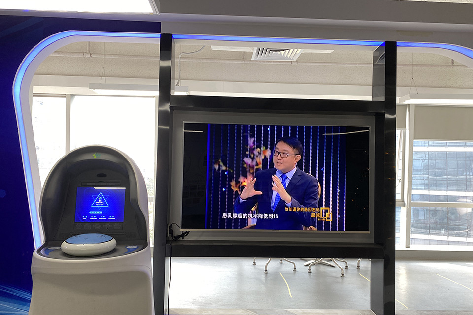 核子基因位于深圳的总部,创始人张核子接受节目访谈的片段在电视上循环播放。(南方周末记者 封聪颖/图)2021年1月17日,河北省邢台市卫健委通报隆尧县核酸检测结果谎报一事,舆论哗然。