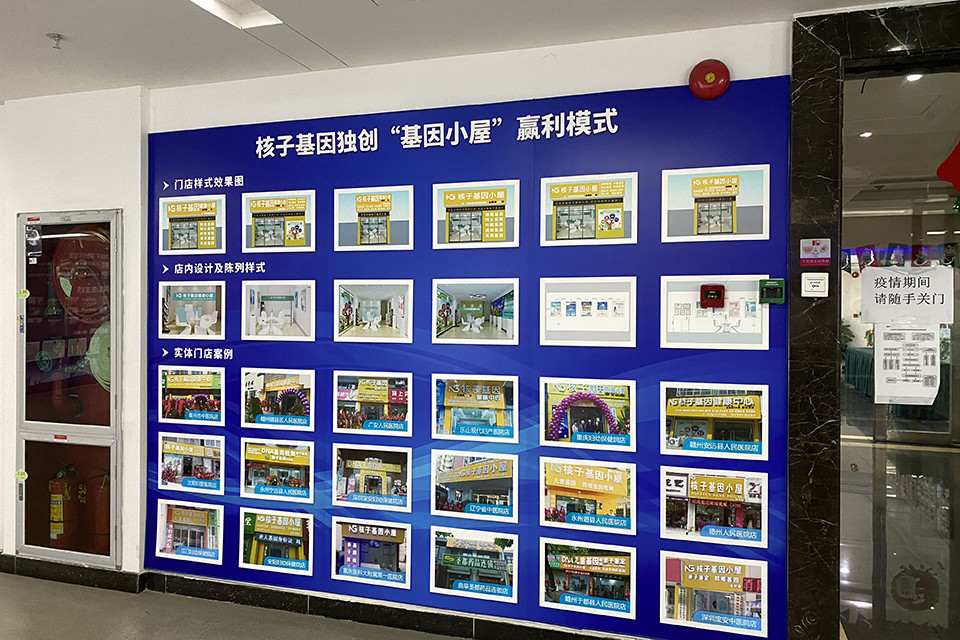 核子基因总部入门处,有巨幅海报介绍公司的加盟模式。(南方周末记者 封聪颖/图)灰色业务